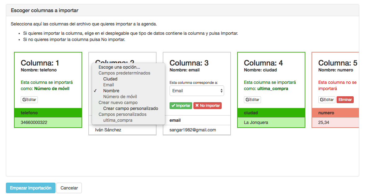 En el segundo paso debemos indicar que campos del archivo de contactos debemos importar y relacionarlo con un campo de datos del contacto para su importación.