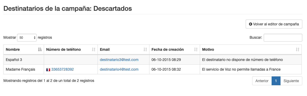 Si pulsas encima de cada uno de los contadores, podrás consultar el listado de contactos que lo componen. En este caso, estamos viendo los descartados del ejemplo anterior.