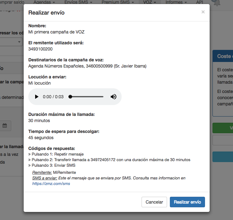 En este paso escogeremos un nombre para identificar la campaña de VOZ y el remitente de la llamada, que en este caso será un teléfono para VOZ validado.