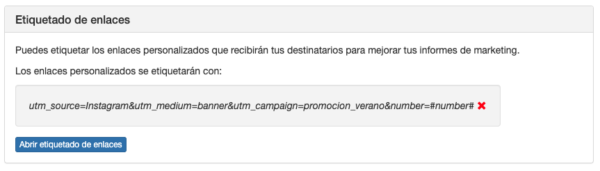 Si incluyes enlaces acortados, landings o formularios en tus envíos, puedes etiquetar los enlaces para añadir campos personalizados y conocer en qué enlaces se ha hecho clic y si se han generado conversiones.