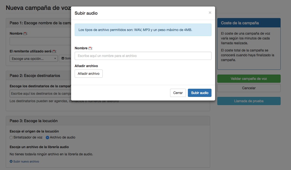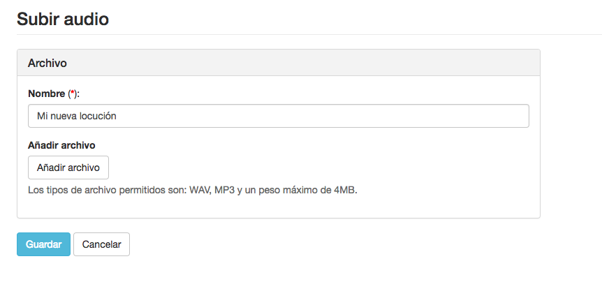 Escoge un nombre para la locución y añade el archivo. Los tipos de archivo permitidos son: WAP y MP3 con un peso máximo de 4MB.