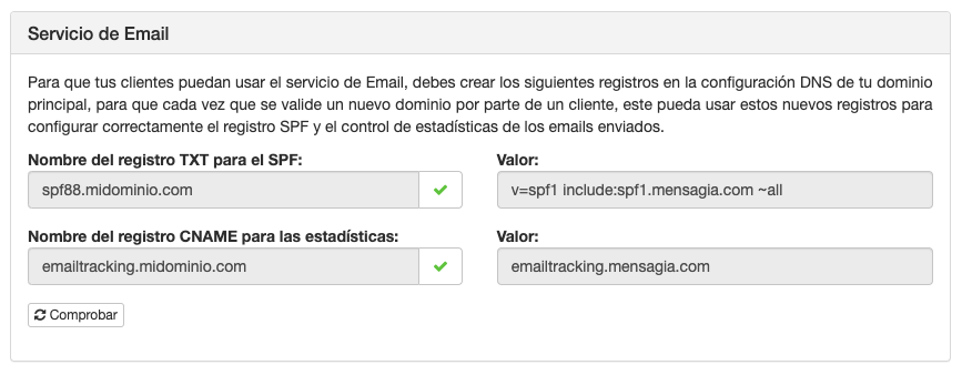 spf88con el valorv=spf1 include:spf1.mensagia.com ~allpara autentificar los envíos de email de tus clientes - Debes crear un nuevo registro CNAME en la zona DNS de tu dominio con nombre