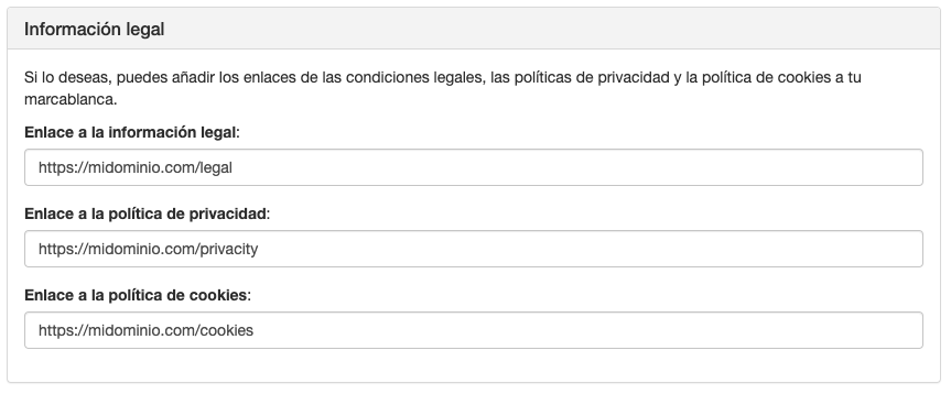 En este apartado debes añadir los enlaces a la información legal de tu empresa. Los enlaces aparecerán en la página de login de tu marca blanca y cuando sea requerido mostrar información legal.