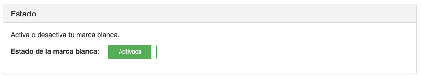Una vez hayas configurado la información general de la Marca Blanca y hayas configurado una cuenta de email para las notificaciones de plataforma puedes activar o desactivar tu marca blanca.
